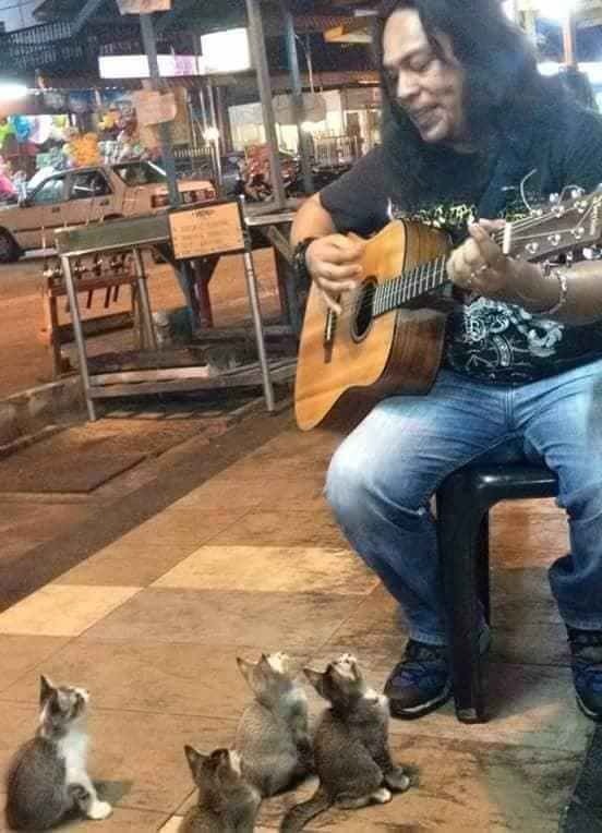 Although nobody stood by and listened to him, he did catch the attention of an unlikely group of music lovers. As he was singing, four 3-month-old kittens sat and listened to him sing and play his guitar. They may be an unlikely audience, but they were the cutest and most supportive crowd any performer could ever have.